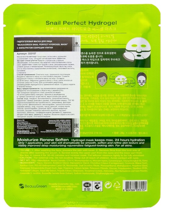 - Состав вода, глицерин, бутиленгликоль, дипропиленгликоль, каррагенан, камедь рожкового дерева, ксантановая камедь, ПЭГ-60 гидрогенизированное касторовое масло, ниацинамид, фильтрат слизи улитки, феноксиэтанол, метилпарабен, пропиленгкликоль, гуаровая камедь, агар, отдушка, лактат кальция, хлорид калия, глюкоза, пропилпарабен, динатрий ЭДТК, гидролизованный коллаген, экстракт пчелиного маточного молочка, экстракт прополиса, убихинон, токоферола ацетат (витамин Е), аденозин, экстракт алоэ вера, церамид-3, лецитин, босвелия серрата экстракт, гиалуронат натрия, этилгексилглицерин