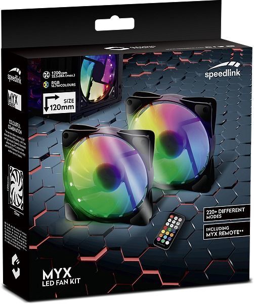 Papildoma informacija2 x 120 mm RGB LED ventiliatorius, skirtas kompiuterio korpusams. Virš 220 skirtingų apšvietimo režimų. Visi režimai sukonfigūruoti naudojant nuotolinio valdymo pultą. Ventiliatoriaus greitis: 1200 aps / min (reguliuojamas nuotoliniu būdu). Oro srautas: 65 kubinės pėdos per minutę. Ventiliatoriaus jungtis: 6 kaiščiai