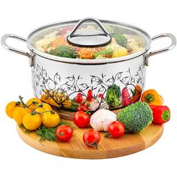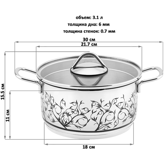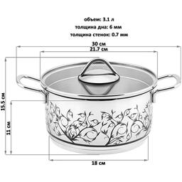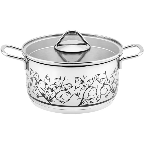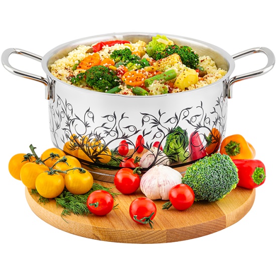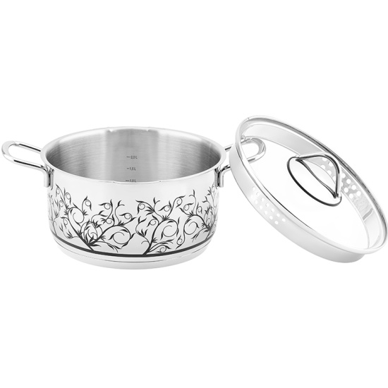 Кастрюля Elan Gallery ГАРМОНИЯ ВКУСА серебро c крышкой, 20 см, 3,1 л Кастрюля серии "Гармония вкуса: серебро" объемом 3,1 литра с крышкой станет удобным помощником на кухне при приготовлении супов, каш, рагу, компотов и самых разных блюд. Кастрюля выполнена из высококачественной стали 18/10 и украшена растительными орнаментами falez. Обладает капсулированным дном с алюминиевой прослойкой, благодаря чему быстро и равномерно нагревается. Внутри кастрюли имеется мерная шкала. Ручками кастрюли в процессе приготовления можно пользоваться без прихваток. Кастрюля проста в уходе и сохранит привлекательный внешний вид даже спустя долгое время. Нержавеющая сталь устойчива к появлению царапин и налета, а сильные загрязнения и копоть отмываются без следа. Подходит для использования на любых типах плит, в том числе индукционных. Можно использовать в духовом шкафу без крышки. При использовании на стеклокерамической поверхности всегда поднимайте посуду при перемещении по плите. Поставляется в стильной картонной упаковке. Гарантия 5 лет.