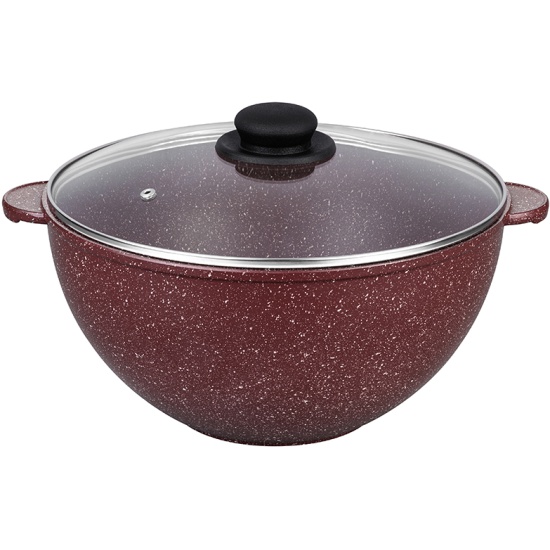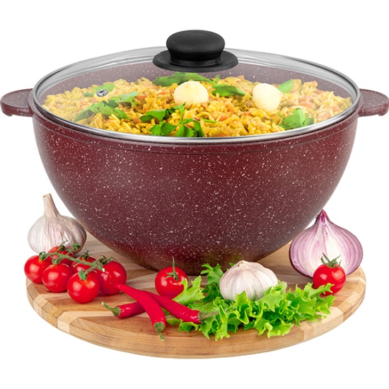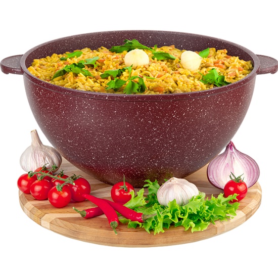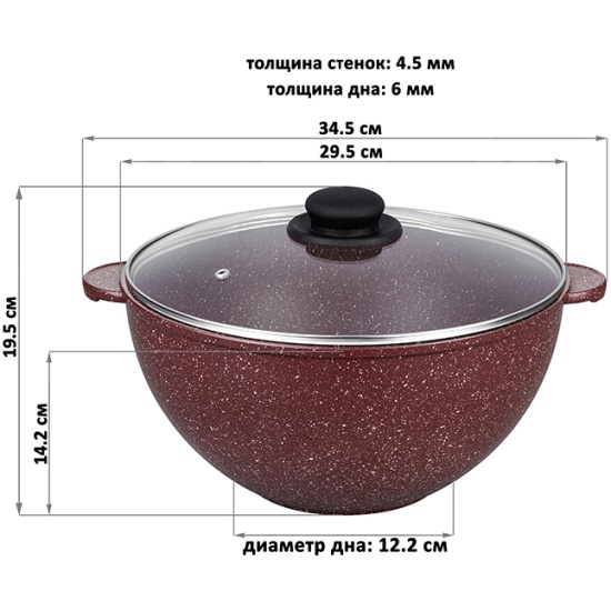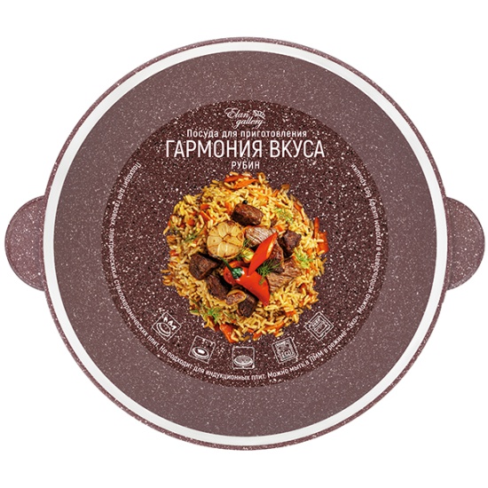 Казан Elan Gallery ГАРМОНИЯ ВКУСА рубин с крышкой, 28 см, 6 лКазан объемом 6 литров "Гармония вкуса" с крышкой изготовлен из литого алюминия в России и имеет ультрапрочное двухслойное антипригарное покрытие. Главное преимущество покрытия - устойчивость к царапинам и износу. Покрытие безопасно для человека и не содержит PFOA или других вредных веществ. Не нагревать без продуктов. Дайте посуде остыть, прежде чем помещать ее в воду. Использовать только деревянные и силиконовые приборы. Не мыть с применением абразивных или щелочных моющих средств. Использовать в посудомоечной машине только в режиме "Эко". Можно использовать в духовом шкафу без крышки при температуре до 250 градусов.