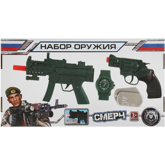 Игровой набор оружия «Военный» ТМ «Играем вместе» обязательно понравится юному герою:- звуковое сопровождение- световые эффектыВ комплекте:- автомат- револьвер- часы- военные жетоныС игровым набором маленький солдат будет придумывать увлекательные спецзадания, защищать мир и стоять на страже порядка. Подойдёт для активных игр на воздухе и в помещении.Игровой набор ТМ «Играем вместе» поможет развить:- координацию движений- воображение- ловкость и меткость- внимание- моторикуРазмер: 39 x 21 x 5 см. Материал: пластмасса.Рекомендовано детям от 3-х лет.