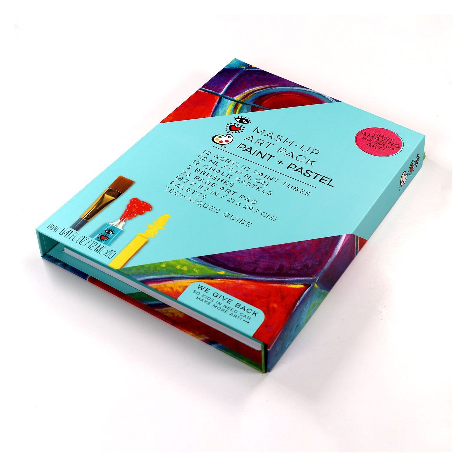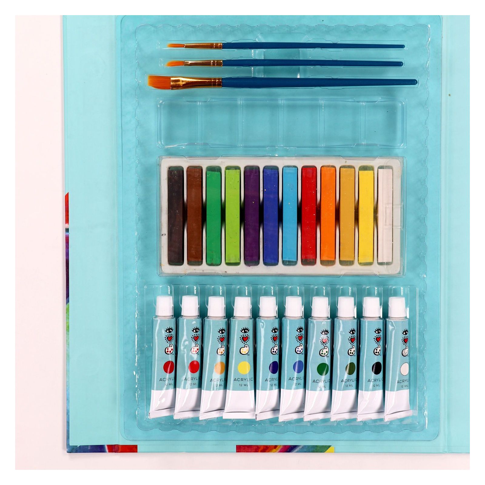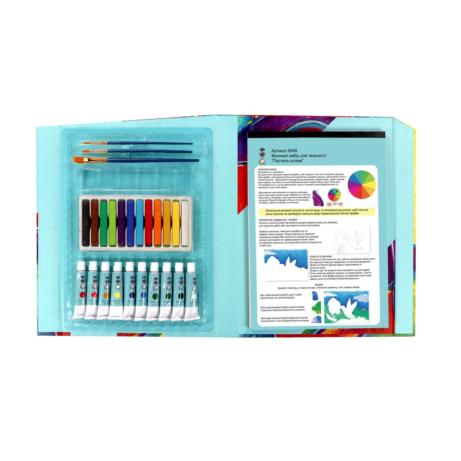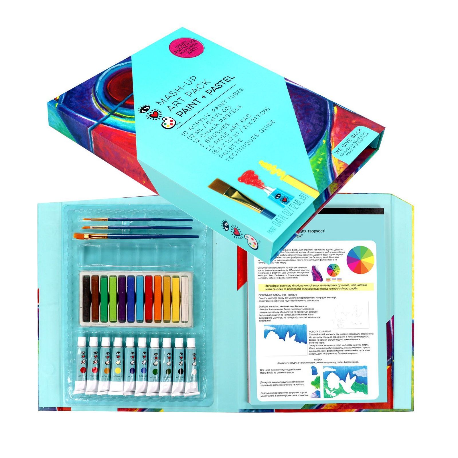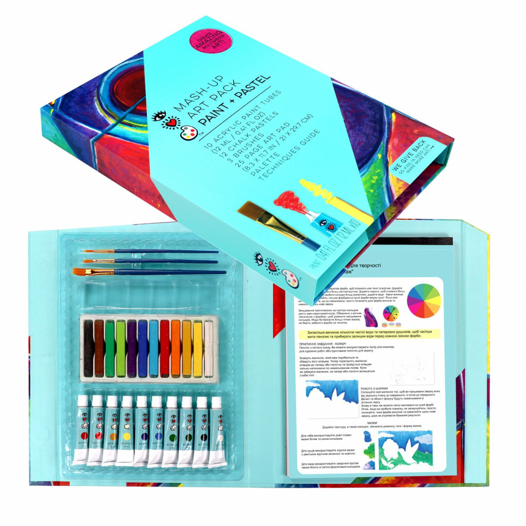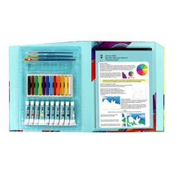 Поставляється з 10 тубиками з акриловою фарбою, 12 крейдяними пастелями, 3 пензликами, 25-сторінковою художньою подушкою, палітрою та посібником з техніки.