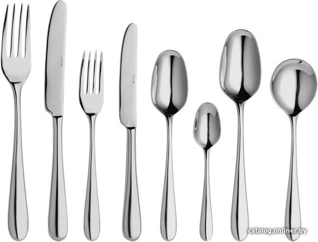 - Состав столового набора вилка столовая, вилка десертная, ложка столовая, ложка чайная, ложка десертная, ложка для сервировки, нож столовый, нож десертный