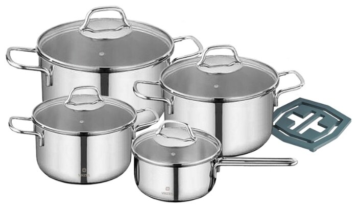 - Подробная комплектация ковш: 1.1 л; кастрюли: 1.5 л, 3.4 л, 5.9 л; 4 крышки; бакелитовая подставка