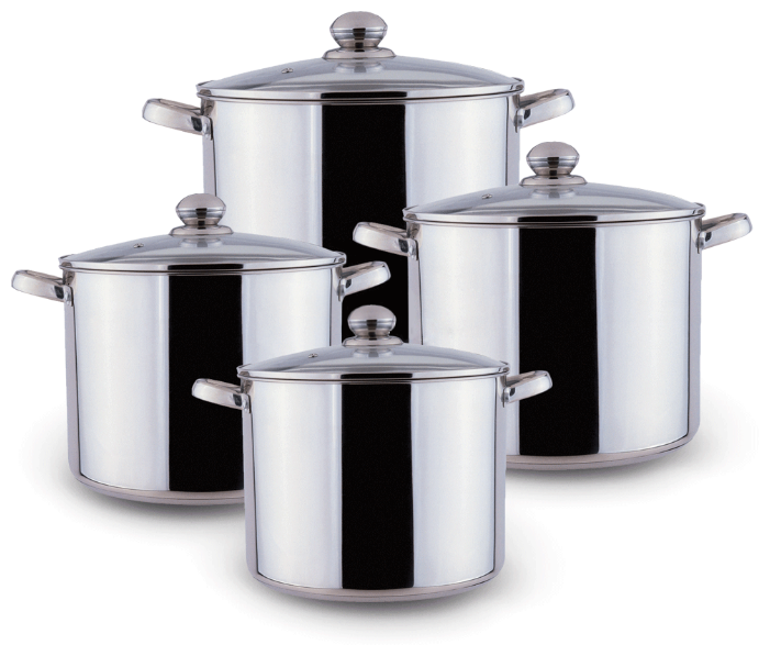 - Подробная комплектация кастрюли: 7.5 л, 9.5 л, 12 л, 13.5 л; 4 крышки