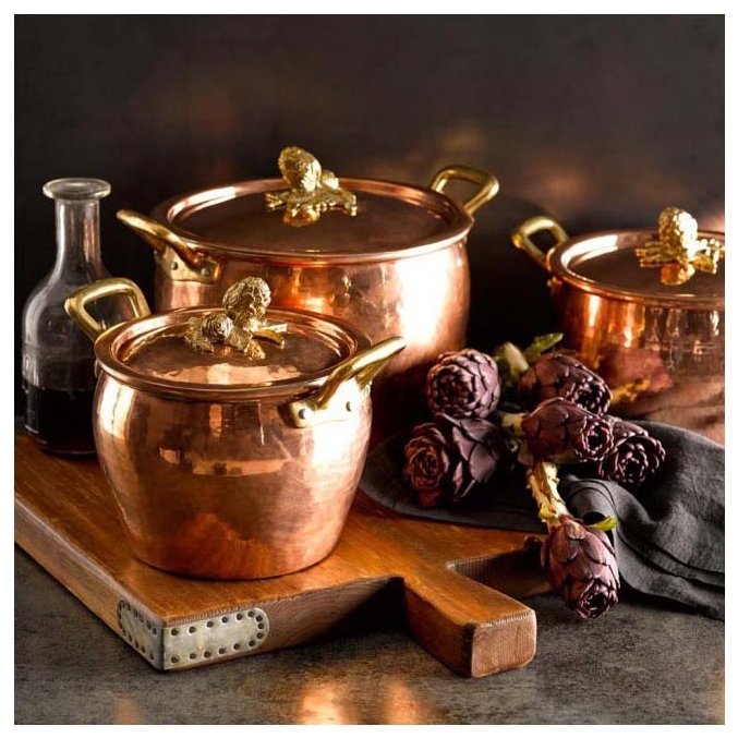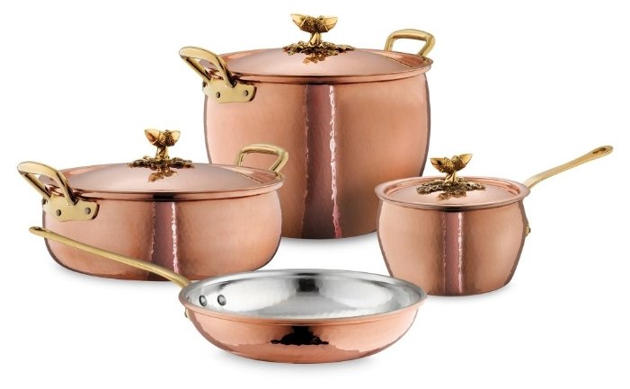 Дополнительная информациялатунные ручки на крышках изготовлены вручную; набор из меди толщиной от 1 до 1.5 мм; внутренняя поверхность покрыта оловом толщиной от 1.5 до 3 мм