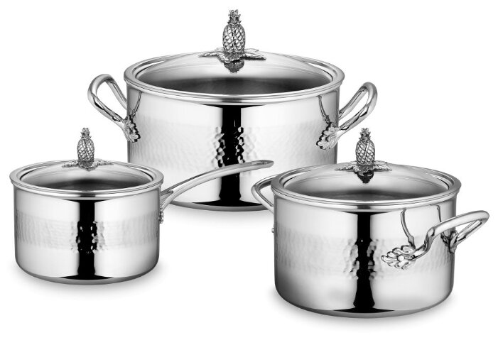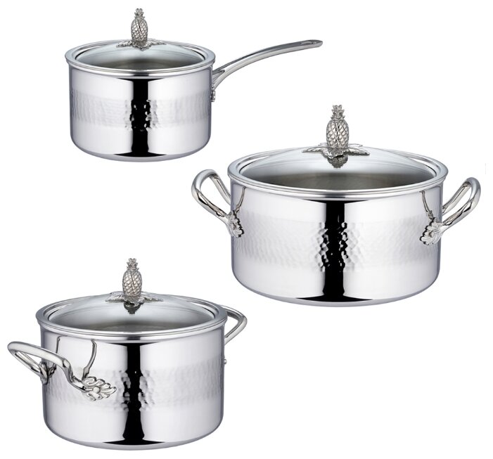 Дополнительная информациядиаметр/высота стенок: ковш 180х115 мм, кастрюли 200х120 мм, 240х126 мм; чеканка и декор ручной работы; многослойное дно: чередуются слои из нержавеющей стали и алюминия