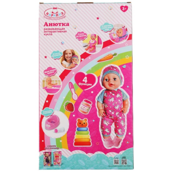 Пупс КАРАПУЗ Y40BB-VCB-42325 Анютка 40 смФункциональный пупс с аксессуарами «Анютка» ТМ «Карапуз» станет прекрасным подарком для вашей принцессы:- пьёт из бутылочки- ходит на горшок- закрывает глазкиЭтот милый пупс, с детально проработанным личиком, обязательно понравится вашей малышке. Кукла одета в симпатичный комбинезон розового цвета с принтом в виде единорогов и с блестящими голубыми рукавчиками. На голове - шапочка под цвет комбинезона. Одежда легко снимается и надевается.Игра с интерактивным пупсом ТМ «Карапуз» учит ребёнка заботиться об окружающих, быть ответственным и внимательным, а также развивает:- воображение- память- социально-коммуникативные навыкиРост куклы: 40 см.Материал: пластмасса + текстиль.Рекомендовано детям от 3-х лет.