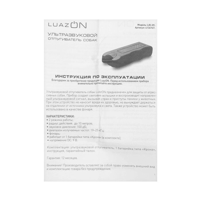 Отпугиватель собак LuazON LRI-09, ультразвуковой, питание от "Кроны"в комплекте)
