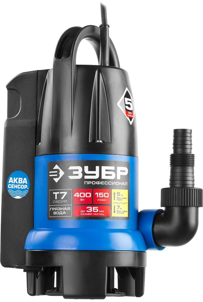 - Название по накладной Насос Т7 АкваСенсор погружн, ЗУБР Профессионал НПГ-Т7-400, дренаж. для грязн воды(d частиц до 35мм), 400Вт, датчик уровня, 150л/мин, напор 5м, провод 10м