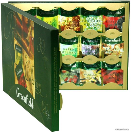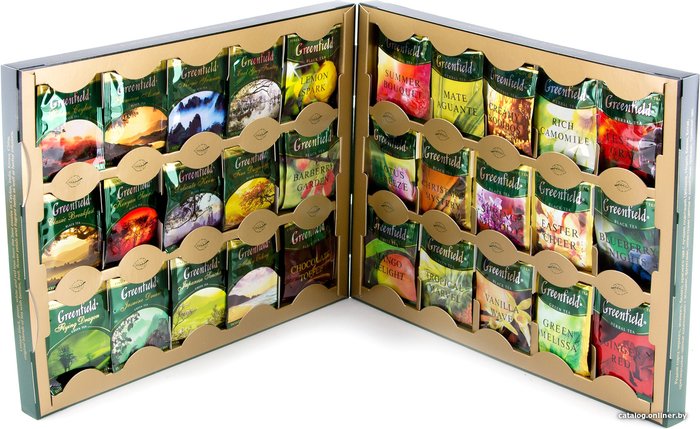 - Состав В наборе представлены образцы классической коллекции Greeenfield, такие как насыщенный и яркий Golden Ceylon, Magic Yunnan с дымным ароматом, терпкий и пряный Premium Assam, великолепный Kenyan Sunrise, тонизирующий Classic Breakfast, Delicate Keemun с его богатым «спелым» вкусом, Fine Darjeeling с волнующим игристым вкусом, выразительный тонкий Milky Oolong, благородный зеленый чай Flying Dragon, утонченный Japanese Sencha, знаменитый жасминовый чай Jasmine Dream, блестящий Earl Grey Fantasy.Также представлен чай из гербальной коллекции Greenfield, такой как легкий Lemon Spark, яркий Barberry Garden, нежный Blueberry Nights, деликатный Lotus Breeze, рождественский Christmas Mystery, свежий Spring Melody, сливочно-карамельный Vanilla Wave, шоколадный Chocolate Toffee, освежающий Green Melissa, этнический Mate Aguante, летние Summer Bouquet и Ginger Red, сладковатый Rich Camomile и цветочный Camomile Meadow, экзотический Mango Delight, Creamy Rooibos с естественным сладковатым вкусом, пасхальный Easter Cheer, праздничный Festive Grape.