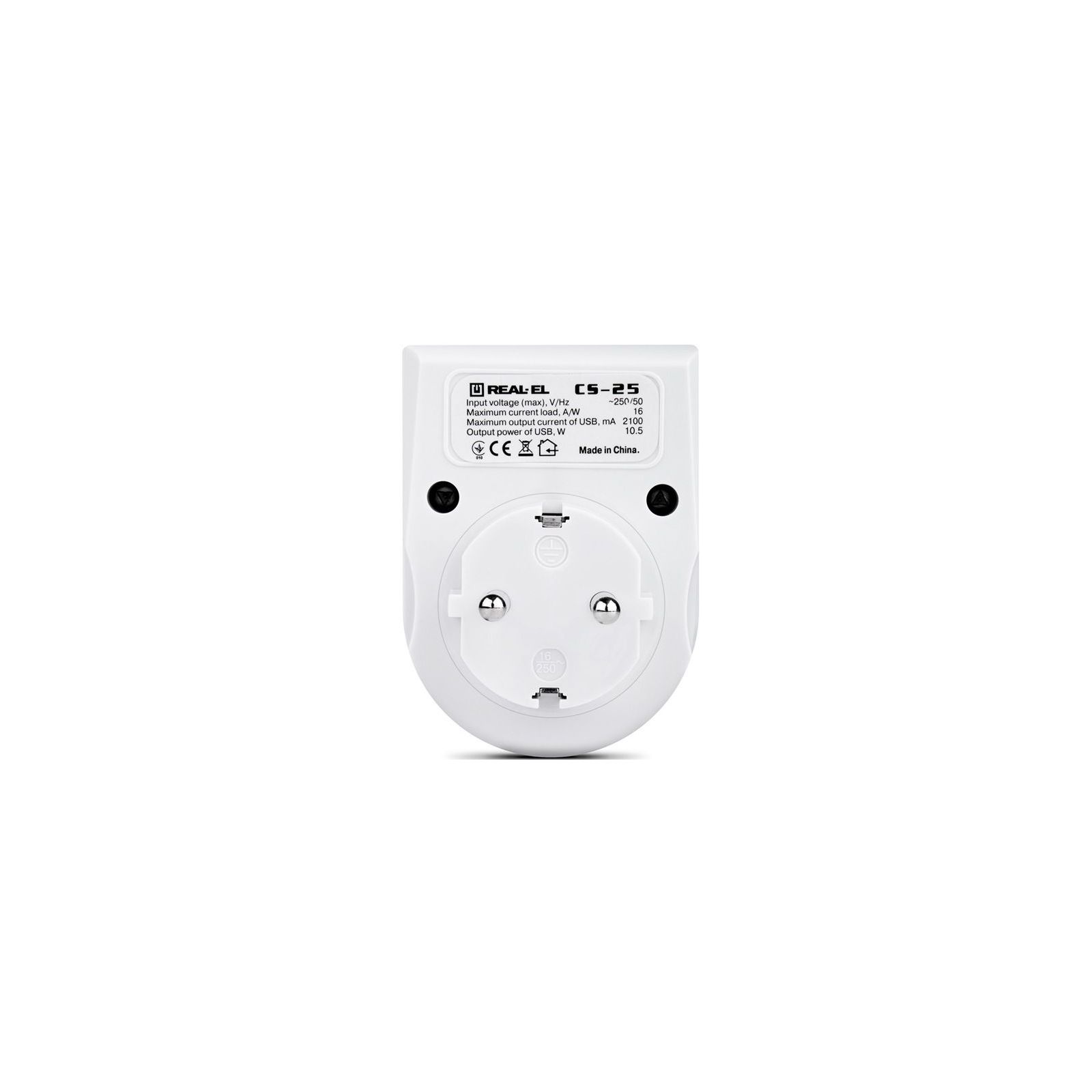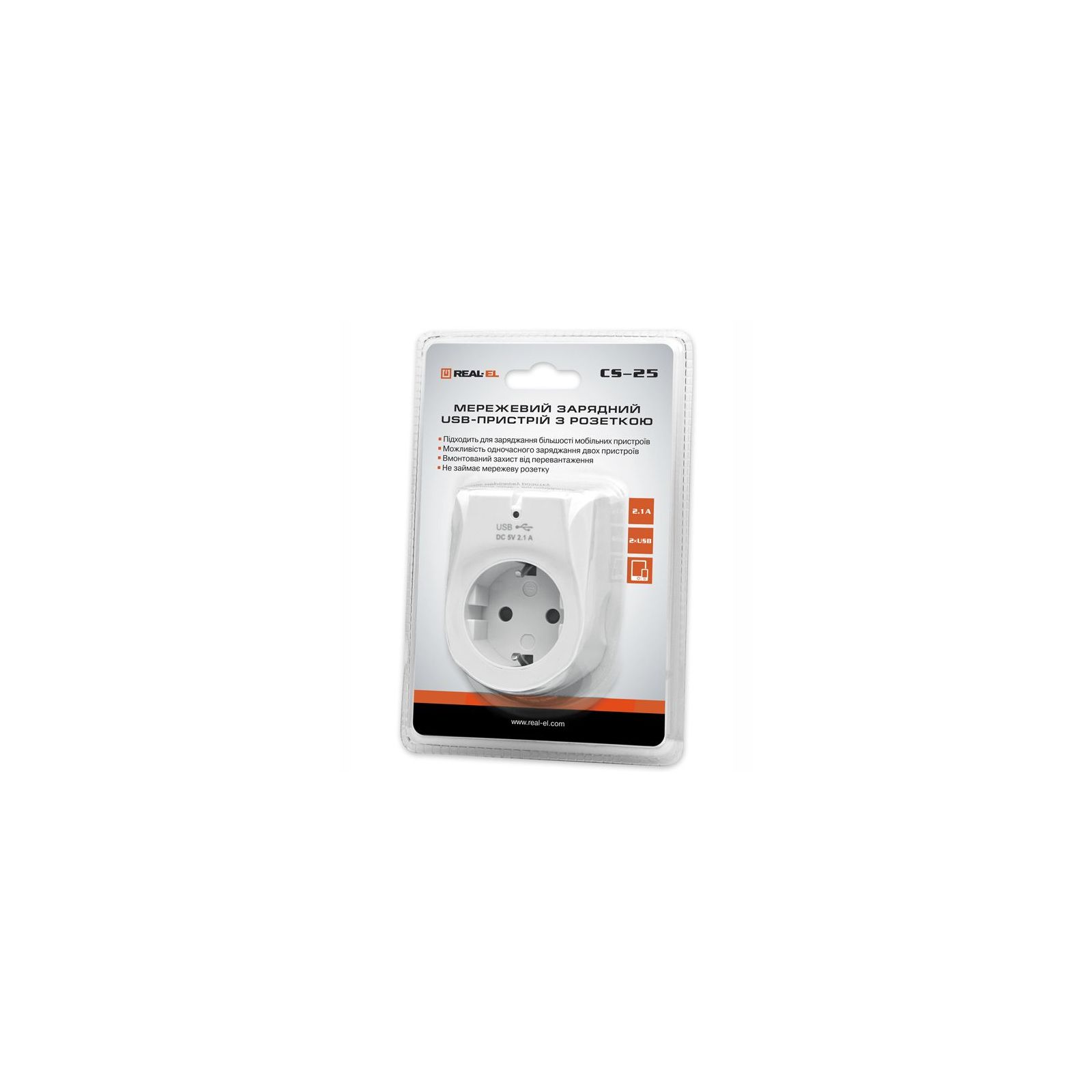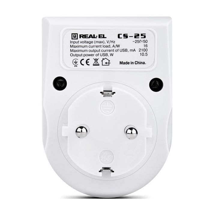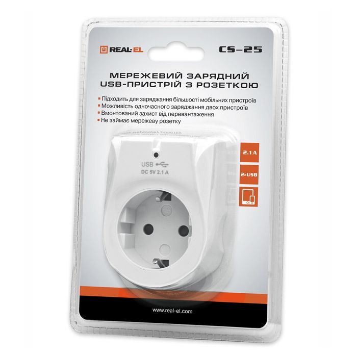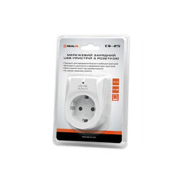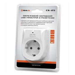 Мережевий зарядний USB-пристрій із розеткою Real-El CS-25 призначений для заряджання акумуляторів портативних пристроїв (мобільних телефонів, смартфонів, MP3-плеєрів, КПК, планшетних комп'ютерів та інших цифрових пристроїв) і живлення портативної акустики від побутової електромережі.