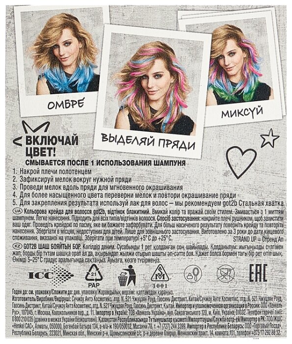 - Способ применения зафиксировать мелок вокруг пряди. Провести мелком вдоль пряди для окрашивания. Для более насыщенного цвета перевернуть мелок и повторить процедуру. Закрепить результат лаком для волос