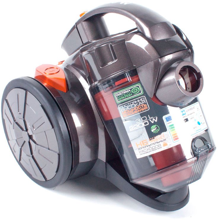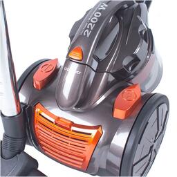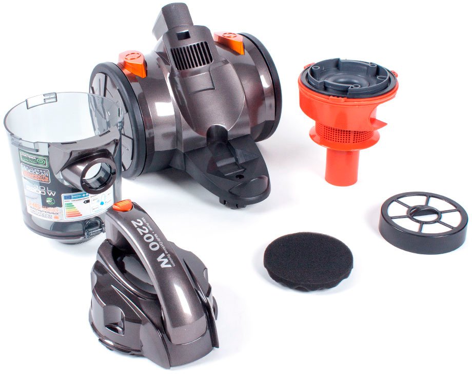 Сухая уборка, питание от сети, потребляемая мощность 2200 Вт, мощность всасывания 360 Вт, пылесборник контейнер, уровень шума 58 дБ, телескопическая трубка, материал металл, автосматывание сетевого шнура, вес 2.75 кг.