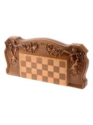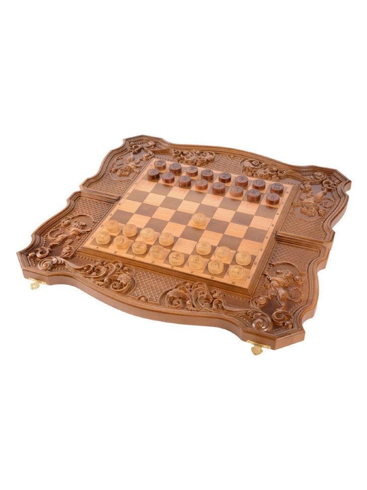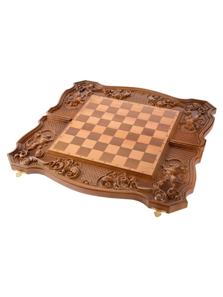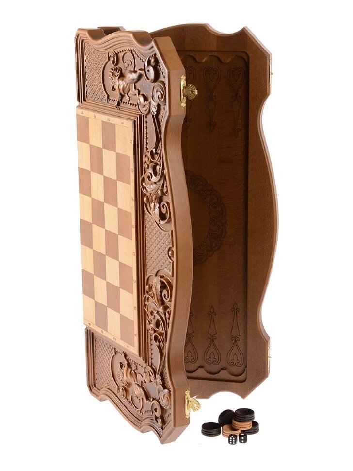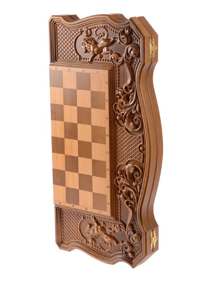Нарды "Львы" с шашками и шахматами из массива бука (59 x 30 x 6 см, объёмный рисунок)
