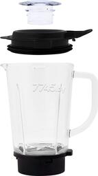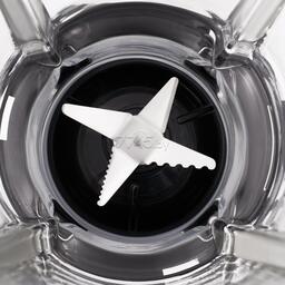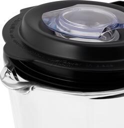 Управление блендером осуществляется с помощью ручки регулировки скорости на передней панели. У блендера 5 скоростей работы и импульсный режим. Блендер оснащён крышкой с уплотнителем, который обеспечивает герметичное закрывание и надёжно удерживает её внутри чаши. Также такая крышка не пропускает запахи и легко моется по окончании использования. Под моторным блоком блендера находятся противоскользящие ножки. Они позволяют оставлять блендер на скользких поверхностях, не боясь, что он упадёт.