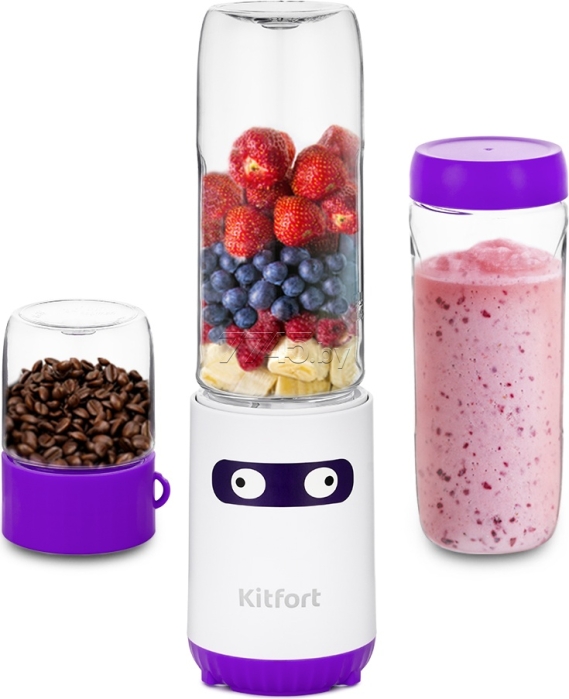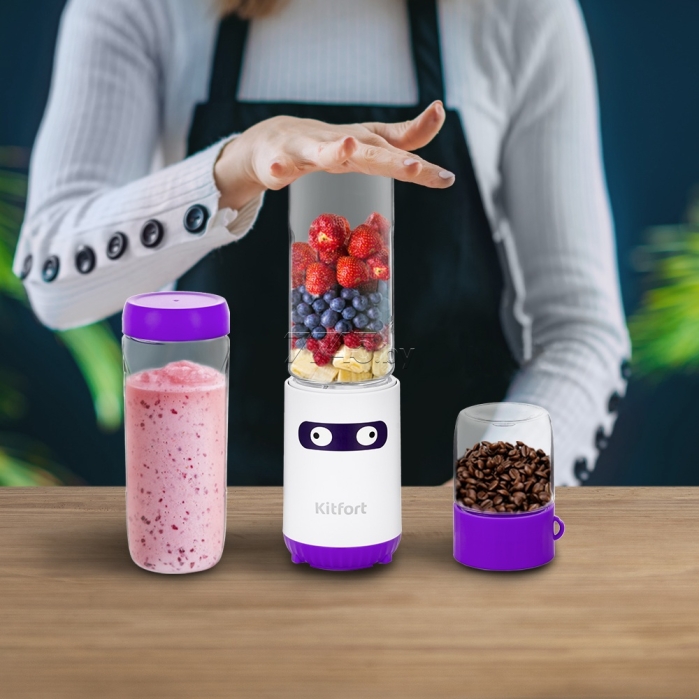 Блендер KITFORT KT-3033-2 бело-салатовый сочетает в себе функции двух устройств. Это блендер с функцией Shake & Take и портативной бутылкой, а также кофемолка. Блендер сделает смузи и коктейли, протеиновые смеси. А кофемолка справится с измельчением кофейных зерен, специй. Вы можете поместить бутылку со смузи в сумочку, взять с собой в спортзал или на работу. Она свободно поместится в подстаканник автомобиля.