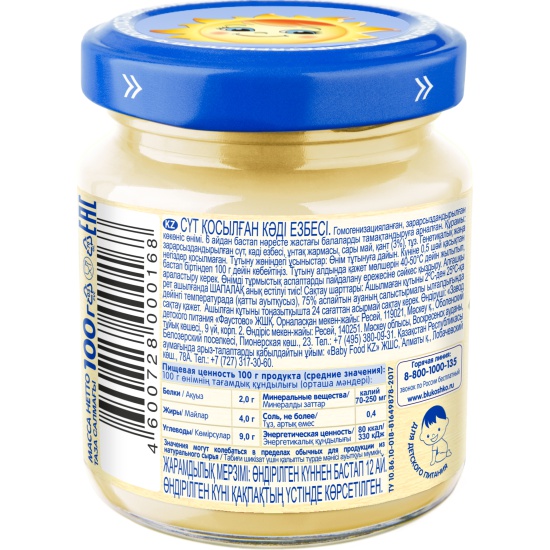 Состав: молоко пастеризованное, пюре из кабачков, крупа манная, масло сливочное, сахар (3%), соль