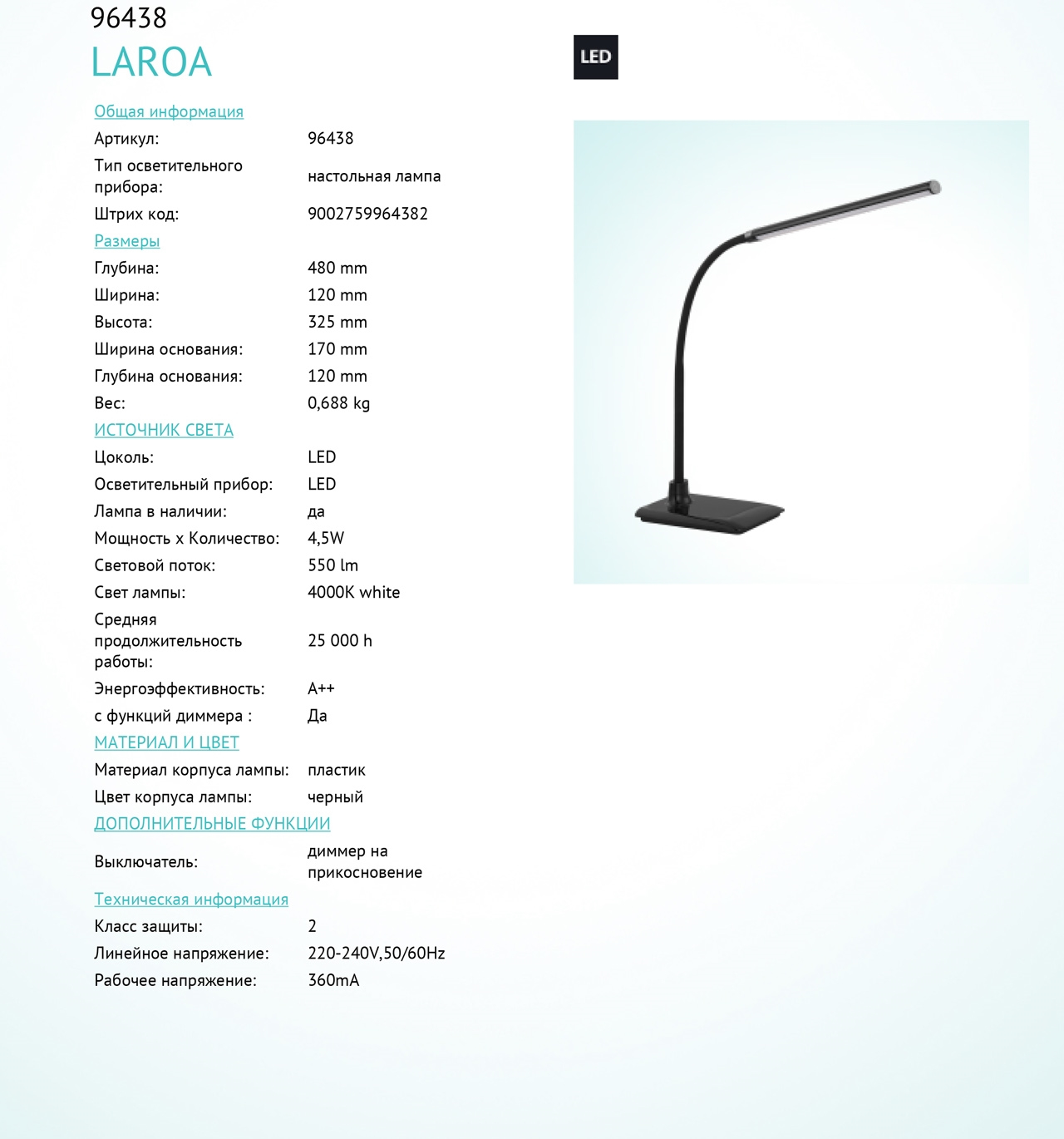 • Дополнительно Настольная лампа светодиодная диммируемая LAROA