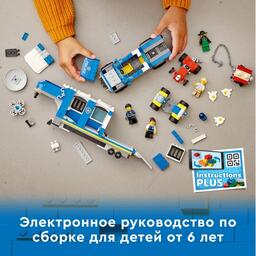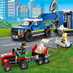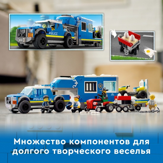 Конструктор LEGO® City Police 60315 Полицейский мобильный командный трейлерС помощью игрового набора «Полицейский мобильный командный трейлер» LEGO City (60315) дети смогут собирать свои собственные истории из сериала «ЛЕГО Сити: приключения». В наборе множество удивительных возможностей, захватывающих функций и крутой техники — это игрушечный полицейский пикап с прицепом с тюрьмой, дроном и квадроциклом, а также трактор с прицепом и стреляющей яйцами пусковой установкой мошенников. Просто добавьте минифигурки Дюк ДеТэйна, Грейси Гудхарт и Снейка Рэттлера, и пусть начнется веселье! Для детей в возрасте от 6 лет. В этот строительный набор LEGO входит пошаговая печатная инструкция по сборке, а в бесплатном приложении LEGO Building Instructions для смартфонов и планшетов доступно интерактивное электронное руководство. Его интуитивно понятные инструменты масштабирования и поворота позволяют детям в процессе сборки рассматривать модели со всех сторон. Вдохновляющий мир LEGO City. Игровые наборы LEGO City оставляют великолепные впечатления от сборки и игры с функциональными зданиями, реалистичной техникой и забавными персонажами, вдохновляющими на творческую открытую игру.Набор с полицией по мотивам сериала LEGO City — набор «Полицейский мобильный командный трейлер» LEGO City (60315) станет источником вдохновения для детей и поклонников сериала «ЛЕГО Сити: приключения».Что в коробке? — все, что нужно детям, чтобы собрать игрушечный полицейский пикап, прицеп с тюрьмой, дрон, квадроцикл и трактор с прицепом, а также 4 минифигурки, включая трех персонажей сериала «ЛЕГО Сити».Особенности и функции — дети могут стрелять яйцами из тракторного прицепа, активировать функцию побега из тюрьмы и наклонять квадроцикл, чтобы рулить во всех направлениях.Подарок на любой случай — эту игрушку с полицейскими LEGO City можно подарить на день рождения, праздник или просто сделать сюрприз детям и поклонникам сериала «ЛЕГО Сити: приключения» в возрасте от 6 лет.Детализированные модели для игры и демонстрации — размеры игрушечного полицейского пикапа в собранном виде составляют более 6 см в высоту, 16 см в длину и 6 см в ширину.Включает аксессуары для минифигурок LEGO — в этот игровой набор с полицейскими входит множество забавных аксессуаров для творческой игры, включая пульт управления игрушечным дроном, наручники и яйца.Интерактивное электронное руководство по строительству — с помощью приложения LEGO Building Instructions, доступного для смартфонов и планшетов, в процессе сборки дети могут увеличивать, поворачивать и рассматривать модели со всех сторон.Развитие творческих навыков — в ходе сборки и игры у детей растет уверенность в себе и развиваются основные жизненные навыки.Концентрация на качестве — все элементы LEGO, произведенные с 1958 года, соответствуют самым строгим отраслевым стандартам, поэтому они совершенно безопасны, совместимы друг с другом, и их интересно собирать.Безопасность на первом месте — все кубики и детали LEGO испытывают на падения, нагрев, удары и скручивание, чтобы убедиться в их соответствии строгим международным стандартам безопасности.