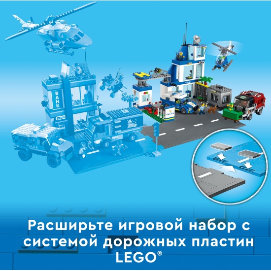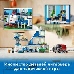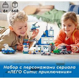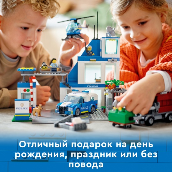 Конструктор LEGO® City Police 60316 Полицейский участокЭтот трехэтажный полицейский участок LEGO City (60316) полон вдохновляющих деталей, включая тюрьму с функцией взлома, тюремный дворик для пойманных преступников и площадку для дрессировки собак. Дети также получат полицейскую машину, вертолет и переделанный мошенниками мусоровоз, а еще дорожную плиту для соединения с другими игровыми наборами. Просто добавьте 5 минифигурок, включая трех персонажей сериала «ЛЕГО Сити: приключения», и начинайте игру. Веселая сборка для детей в возрасте от 6 лет. В этот строительный набор LEGO входит пошаговая печатная инструкция по сборке, а в бесплатном приложении LEGO Building Instructions для смартфонов и планшетов доступно интерактивное электронное руководство. Его интуитивно понятные инструменты масштабирования и поворота позволяют детям в процессе сборки рассматривать каждую модель со всех сторон. Мир творческого конструирования LEGO City. Игровые наборы LEGO City оставляют великолепные впечатления от сборки и игры с функциональными зданиями, реалистичной техникой и забавными персонажами, вдохновляющими на творческую открытую игру.Набор с полицейским участком по мотивам сериала LEGO City — набор «Полицейский участок» LEGO City (60316) станет источником вдохновения для детей и поклонников сериала «ЛЕГО Сити: приключения».Что в коробке? — все, что нужно детям, чтобы построить трехэтажный полицейский участок, патрульную машину, вертолет и мусоровоз, а также фигурка собаки и 5 минифигурок, включая трех персонажей сериала «ЛЕГО Сити».Возможности и функции — у мусоровоза есть подъемник для контейнеров и два тарана, чтобы разрушить тюремную стену для легкого побега. Также в набор входит дорожная плита для соединения с другими наборами LEGO City.Подарок на любой случай — игрушечную полицейскую машину LEGO City можно подарить на день рождения, праздник или просто сделать сюрприз ребенку в возрасте от 6 лет.Модели для игры и демонстрации — размеры полицейского участка в собранном виде составляют более 27 см в высоту, 28 см в ширину и 24 см в глубину.Включает аксессуары для минифигурок LEGO — в этот игровой набор с полицейскими входит множество забавных аксессуаров для творческой игры, включая рацию, фотокамеру, какашку и пончик.Интерактивное электронное руководство по строительству — с помощью приложения LEGO Building Instructions, доступного для смартфонов и планшетов, в процессе сборки дети могут увеличивать, поворачивать и рассматривать модели со всех сторон.Развитие творческих навыков — в ходе игры дети развивают уверенность в себе и основные жизненные навыки.Качество в центре внимания — все элементы LEGO, произведенные с 1958 года, соответствуют самым строгим отраслевым стандартам, поэтому они совершенно безопасны, совместимы друг с другом, и их интересно собирать.Безопасность на первом месте — все кубики и детали LEGO испытывают на падения, нагрев, удары и скручивание, чтобы убедиться в их соответствии строгим международным стандартам безопасности.