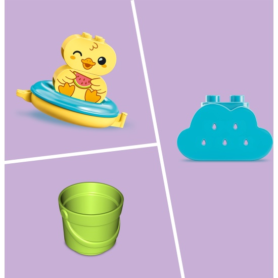Конструктор LEGO® DUPLO® My First 10965 Приключения в ванной: плавучий поезд для зверейНабор «Приключения в ванной: плавучий поезд для зверей» LEGO DUPLO (10965) — это легко моющаяся развивающая игрушка для ванной для малышей в возрасте от 18 месяцев. Плавающая и легко моющаяся игрушка для купания. Сделайте купание малыша еще веселее с этим милым бегемотом, уточкой и белым медведем. Трое животных сидят в плавательных кругах разного цвета, которые крепятся друг к другу. Здесь есть ведро, чтобы мыть животных, и облако, из которого идет дождь. Закругленные крючки позволяют детям легко соединять и разъединять круги, и при помощи этих крючком можно присоединить круги из наборов «Приключения в ванной: Красная панда на плоту» (10964) и «Приключения в ванной: плавучий остров для зверей» (10966) (наборы продаются отдельно). Каждый круг легко открывается для ополаскивания, так что вам просто будет поддерживать чистоту от купания к купанию. Обучение в игре для малышей. Родители могут разделить с детьми драгоценные вехи развития, ведь игрушки LEGO DUPLO — это открытое веселье, самовыражение и радостное исследование в руках маленьких детей.Универсальная игрушка для ванной — яркий набор «Приключения в ванной: плавучий поезд для зверей» LEGO DUPLO (10965) от купания к купанию дает вам игровые возможности для обучения.Животные для сборки — в этот игровой набор входят бегемот, утка и белый медведь, а еще ведро, туча и 3 плавательных круга, которые открываются для быстрой и легкой очистки.Развивающее развлечение — малыши соединяют по 2 кубика, чтобы собрать каждое животное, а затем помещают их в плавательные круги. Удобные для малышей круги соединяются, разъединяются и пускают пузыри, плавая по воде.Подарок для дошкольников — этот практичный игровой набор станет отличным подарком на день рождения или по любому другому поводу для малышей в возрасте от 18 месяцев.Универсальный плавающий поезд — эта игрушка для малышей насчитывает более 11 см в высоту, 46 см в ширину и 11 см в глубину.Обучение в игре — наборы LEGO DUPLO разработаны с упором на увлекательный сюжет, яркие цвета, разнообразных персонажей и многочисленные детали, чтобы у вашего маленького ученика был БОЛЬШОЙ старт в жизни.Постоянство качества — все элементы LEGO DUPLO, произведенные с 1969 года, соответствуют строгим отраслевым стандартам, поэтому их удобно брать, складывать и разъединять маленькими детскими пальчиками.Безопасность гарантирована — все кубики и детали LEGO DUPLO испытывают на падения, нагрев, удары и скручивание и тщательно анализируют, чтобы убедиться в их соответствии требовательным международным стандартам безопасности.