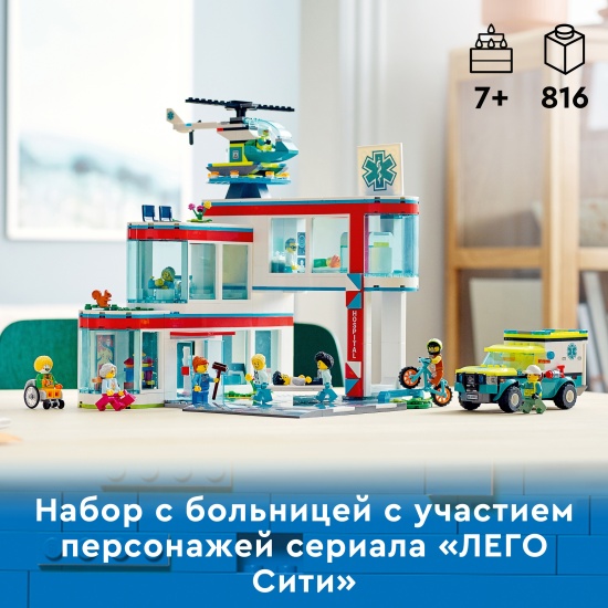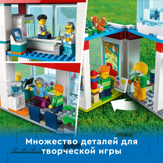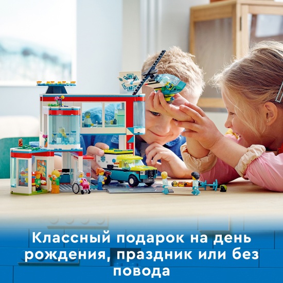 Конструктор LEGO® My City 60330 БольницаИгровой набор «Больница» LEGO City (60330) содержит множество вдохновляющих элементов для творческой игры. Тут есть регистратура, детская игровая комната, родильное отделение, туалет и кабинет для МРТ. Кроме того, в набор входит машина скорой помощи и спасательный вертолет, а также дорожные пластины для соединения с другими наборами LEGO, плюс 12 минифигурок, включая четырех персонажей из телесериала «ЛЕГО Сити: приключения». Печатные и электронные инструкции по сборке. В этот строительный набор LEGO входит пошаговая печатная инструкция по сборке, а в бесплатном приложении LEGO Building Instructions для смартфонов и планшетов доступно интерактивное электронное руководство для детей от 7 лет. Его интуитивно понятные инструменты масштабирования и поворота позволяют детям в процессе сборки рассматривать каждую модель со всех сторон. Мир творческого конструирования LEGO City. Игровые наборы LEGO City ставят детей в центр событий. Функциональные здания, крутая техника и вдохновляющие персонажи приглашают провести много часов за творческой игрой.Набор LEGO City с больницей для детей от 7 лет — игровой набор «Больница» LEGO City (60330) содержит множество деталей для творческой игры.Что в коробке? Все необходимое, чтобы дети собрали игрушечную больницу из нескольких помещений, машину скорой помощи и спасательный вертолет. Кроме того, в наборе 12 минифигурок, среди которых есть четыре персонажа из сериала «ЛЕГО Сити».Набор для творческой игры — в игрушечной машине скорой помощи есть место для входящих в набор носилок, а еще дети могут помещать и доставать минифигурки пациентов из МРТ-сканера.Подарок для начинающих врачей и медсестер — эту игрушку LEGO можно подарить на день рождения, праздник или просто сделать сюрприз ребенку в возрасте от 7 лет.Размеры — в собранном виде здание игрушечной больницы имеет высоту более 24 см, ширину 28 см и глубину 25 см.Включает аксессуары для минифигурок LEGO — в этот игровой набор с больницей входит множество аксессуаров минифигурок для творческой игры, включая медицинский гипс, шприц и кресло-каталку.Интерактивное электронное руководство по строительству — с помощью приложения LEGO Building Instructions, доступного для смартфонов и планшетов, в процессе сборки дети могут увеличивать, поворачивать и рассматривать модели со всех сторон.Развитие творческих навыков — в ходе игры дети развивают уверенность в себе и основные жизненные навыки.Качество в центре внимания — все элементы LEGO, произведенные с 1958 года, соответствуют самым строгим отраслевым стандартам, поэтому они совершенно безопасны, совместимы друг с другом, и их интересно собирать.Безопасность на первом месте — все кубики и детали LEGO испытывают на падения, нагрев, удары и скручивание, чтобы убедиться в их соответствии строгим международным стандартам безопасности.