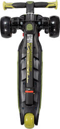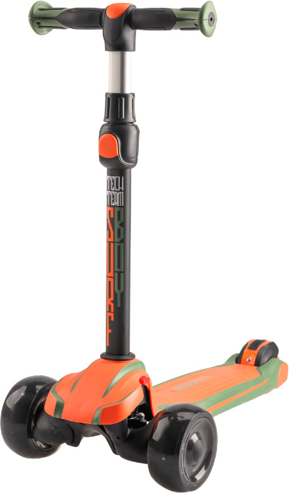 Детский трехколесный самокат-кикборд. Пластиковая дека с противоскользящим покрытием и рельефом 57х13 см. Алюминиевый руль регулируемый по высоте 59-80 см, ширина 27,5 см. Анатомические резиновые грипсы. Колеса светящиеся: PU, 120/80х50 мм. Подшипники ABEC 9 Chrome. Задний ножной тормоз. Руль самоката для транспортировки можно отсоединить и прикрепить к днищу. Цвет: оранжево-зеленый.