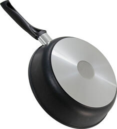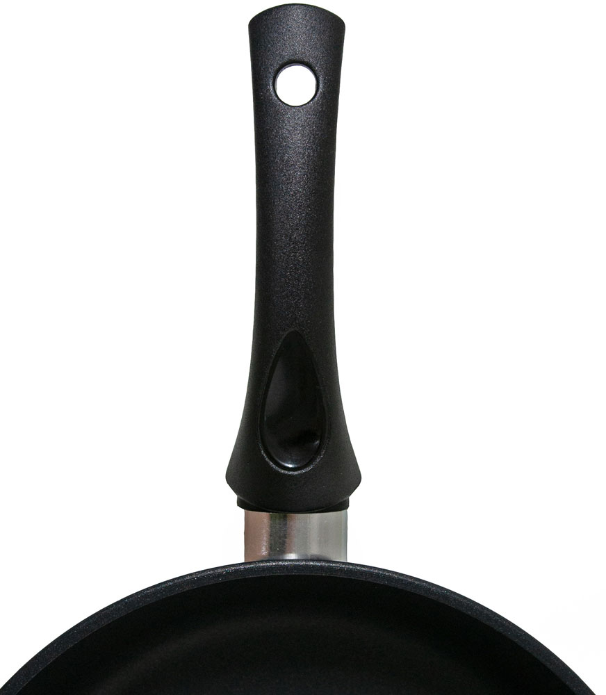 Стандартная, 28 см, покрытие фторопласт, материал корпуса алюминий, ручка: бакелит.