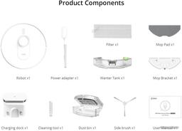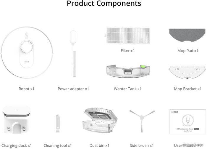 Комплектацияробот-пылесос;док-станция;адаптер с кучей насадок для любой розетки;швабра с единственной салфеткой;запасная торцевая щётка;запасной НЕРА-фильтр;кисточка с разрезателем;пылесборник и бак для воды, которые образуют модуль для комплексной уборки;инструкция.