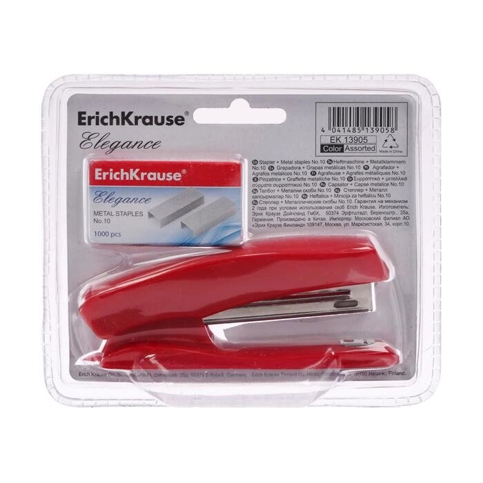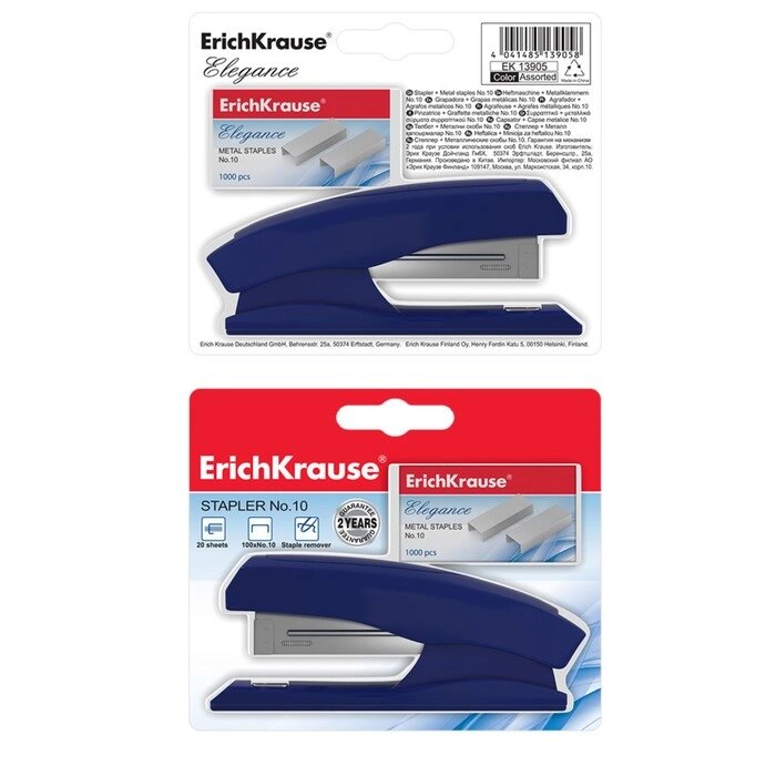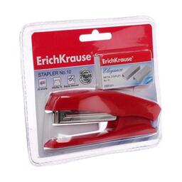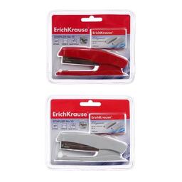 Степлер Erich Krause Elegance + скобы, 10, до 20 листов, в блистере, встроенный антистеплер, синий, МИКС