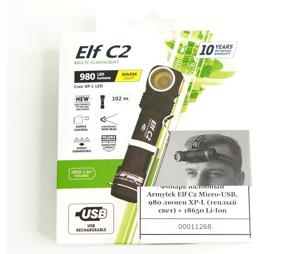 Фонарь налобный Armytek Elf C2 Micro-USB, 980 люмен XP-L (теплый свет) + 18650 Li-Ion