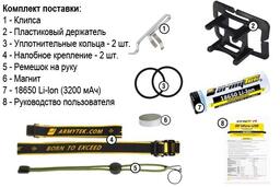 • Комплектация: клипса, пластиковый держатель, уплотнительный кольца, налобное крепление, крепление на руку, зарядное устройство, магнит, инструкция