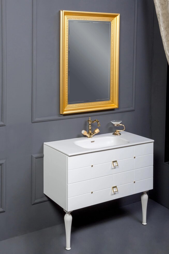 • Варианты комплектации Зеркало, Сифон, Донный клапан, Полка под зеркало, Смеситель для раковины, Ножки для мебели