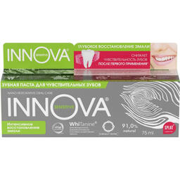 Клінічно доведено, що засоби INNOVA помітно знижують підвищену чутливість зубів, ефективно відновлюють і безпечно освітлюють емаль уже після першого застосування. Не містить: SLS, хлоргексидин, триклозан, солі калію, з'єднання алюмінію, карбонат кальцію, агресивні абразиви, фосфати та пірофосфати, сахарин натрію, сполуки пероксиду.