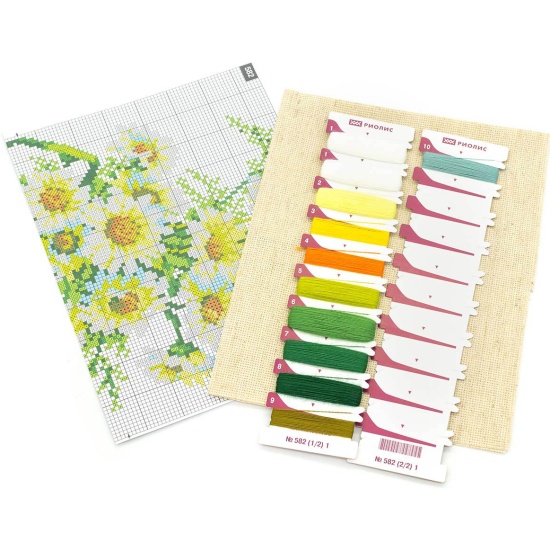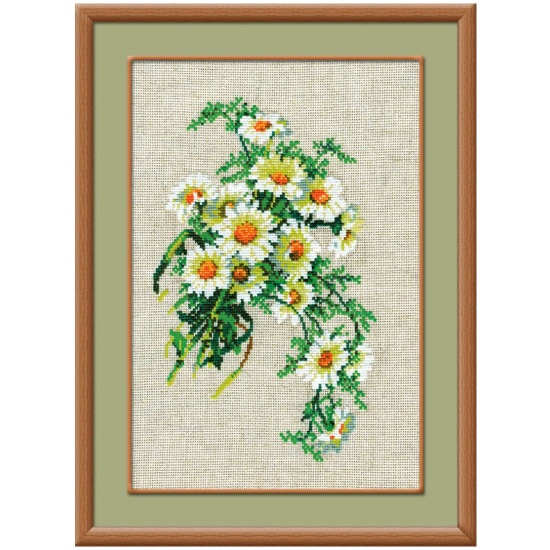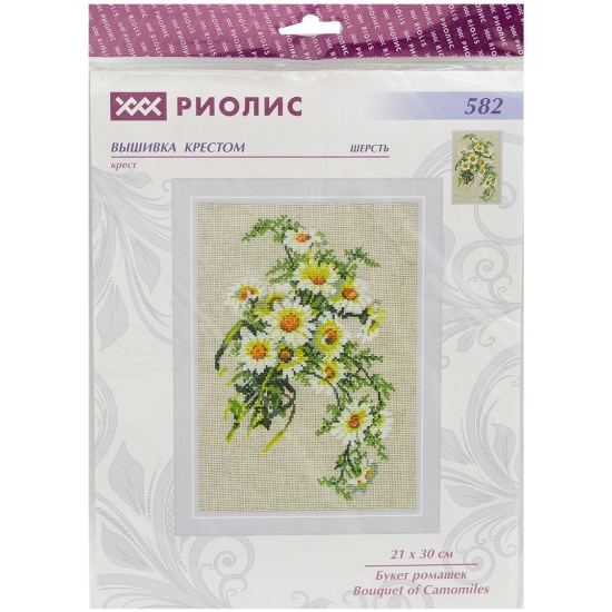 Набор для вышивания РИОЛИС 582 Букет ромашек, 21*30 смВ наборе: канва Aida 15 Zweigart белая, нитки для вышивания шерстяные, игла, цветная схема, инструкция.