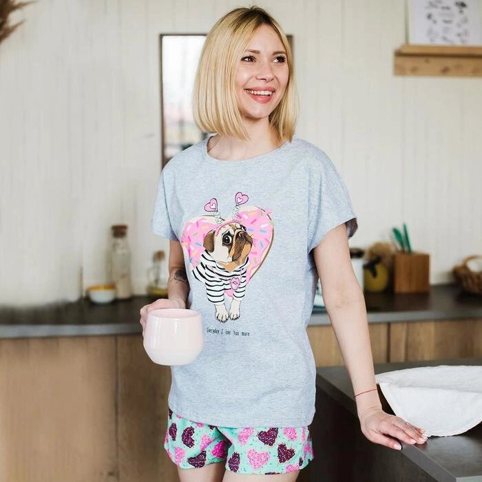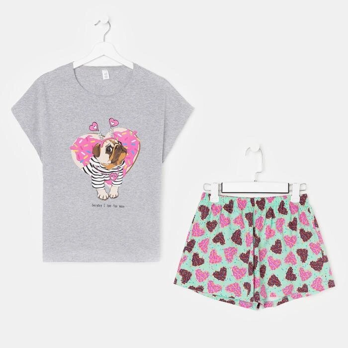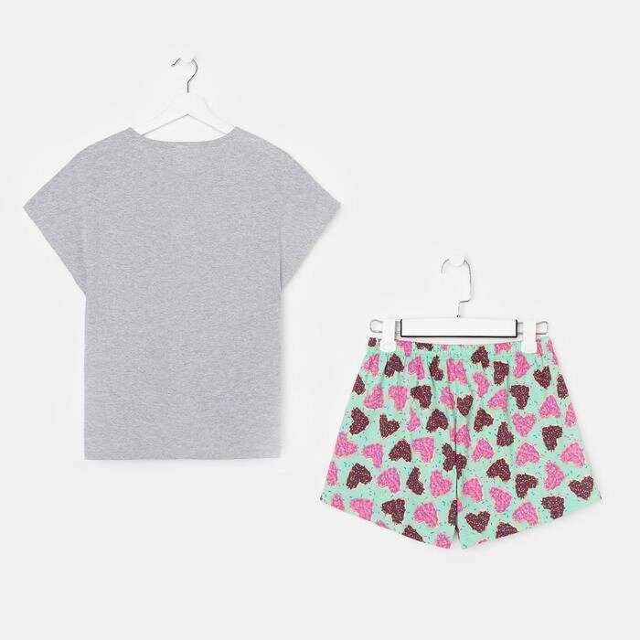 Пижама женская (футболка, шорты), цвет серый/сердечки на мятном, размер 50