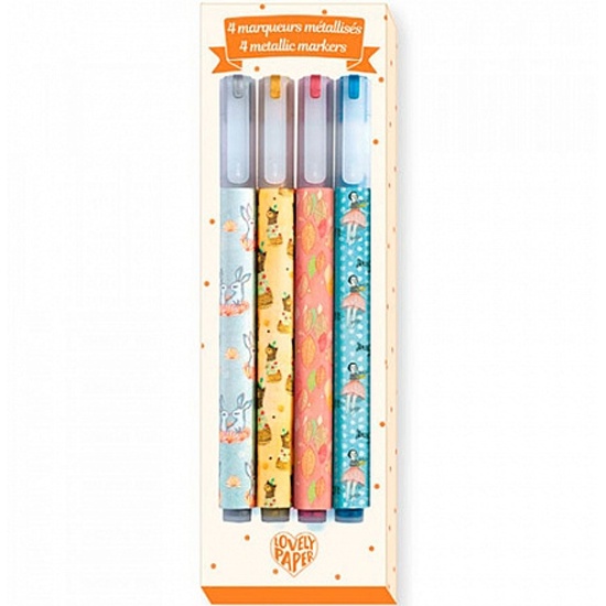 Фломастеры DJECO DD03745 металлик, 4 шт.Фломастеры металлик из новой серии канцелярских товаров Lovely Paper от французского бренда Djeco помогут дополнить и украсить рисунки узорами с металлическим блеском и обязательно понравятся юным художникам. В наборе 4 разноцветных фломастера с металлическим блеском, которыми ребенок сможет разнообразить стандартный набор для творчества с фломастерами, карандашами и красками классических цветов. На каждом фломастере изображены симпатичные узоры. Замечательный набор, который раскроет для ребенка множество вариантов творческого самовыражения. Фломастеры выполнены из высококачественных материалов, безопасных для здоровья ребенка. Небольшой набор фломастеров отлично подходит, чтобы взять его с собой в путешествие или дорогу. Серия детских канцелярских товаров Lovely Paper включает в себя красочные блокноты, открытки, пеналы, фломастеры и карандаши, цветной скотч, стикеры для записок и другие аксессуары. Изображения на изделиях выполнены в свойственном для Djeco необычном и запоминающемся стиле. Все товары отличаются высоким качеством и прекрасно сочетаются друг с другом.