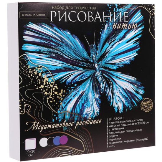 Рисование нитью на холсте ШКОЛА ТАЛАНТОВ Голубая бабочка, 30х30 смВы впервые хотите нарисовать картину, но не уверены в своих художественных навыках? Или рисуете давно и хотели бы попробовать новую необычную технику?Этот набор - отличное решение в обоих случаях!Удивительно, но для создания шедевра, который изображён на упаковке (или который вы придумаете сами), не понадобится даже кисть. Рисунок вы создадите с помощью нити!Рисование нитями помогает расслабиться и отвлечься от повседневных проблем. Это медитативное искусство, которое помогает снять стресс и отдохнуть.В наборе есть всё необходимое, чтобы создать уникальную картину, а подробная инструкция и схемы работы с нитью помогут даже начинающим художникам!