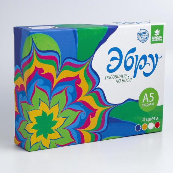 Рисование на воде ШКОЛА ТАЛАНТОВ Эбру, 4 цветовЭбру - это древняя техника рисования на воде, пришедшая к нам с Востока.Для того, чтобы получить интересный результат, совсем необязательно быть мастером живописи, достаточно проявить фантазию. Краски растекаются по поверхности раствора кругами, создавая красивые узоры, а с помощью инструментов (палочек и гребня) можно создать более сложные рисунки.Полученные картинки легко переносятся на бумагу, которая также входит в набор. Эбру-рисунок может стать замечательным подарком членам семьи и друзьям, а также его можно использовать в качестве основы для открыток и других поделок.Освоить новую технику рисования легко, к тому же это прекрасный вариант весело и интересно провести время в кругу семьи!ДополнительноЕсли краски застыли при перевозке, поместите их в тёплое место. Дождитесь, пока краски полностью разморозятся. При застывании краски своих свойств не меняют.