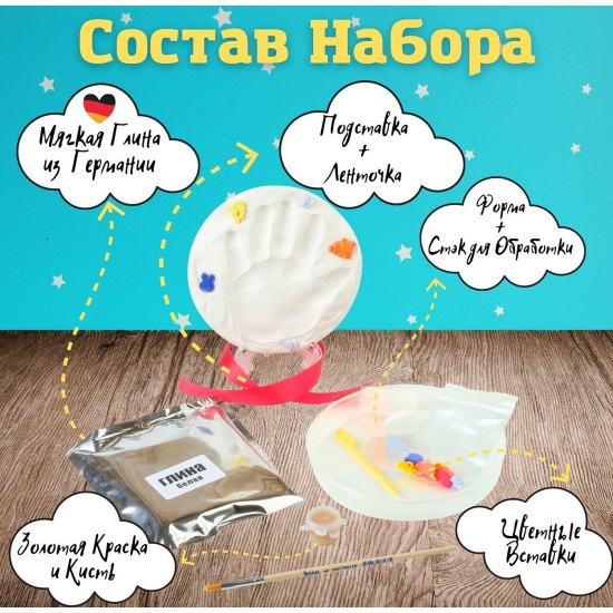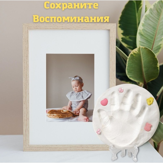 Набор MOSCOW CASTING KITS lz-013 Отпечатки ручек и ножек, белая глина. ПремиумУдивительный набор MOSCOW CASTING KITS для создания отпечатка ручки или ножки.В наборе для создания слепка используется эксклюзивная самозатвердевающая глина, произведённая в Германии. Материал гипоаллергенен и абсолютно безопасен для кожи. Наша глина позволяет без труда создать отпечаток ладошки или ножки. Глина очень мягкая, легко поддается формовке и не трескается при высыхании.Диаметр ладошки или длина стопы для слепка -12.5 см.Подставка в наборе и атласная ленточка позволят поставить или подвесить отпечаток на видное место в доме и радовать вас трогательными воспоминаниями. Пика в комплекте поможет оформить слепок, написав имя, возраст, дату создания или добавить различные узоры для придания оригинальности.Набор для создания слепка ручки или ножки MOSCOW CASTING KITS – трогательный подарок на любое торжество или праздник: Новый год, День рождения и просто незаурядный подарок для молодых родителей в ожидании чуда. Этот набор позволит сохранить ваши приятные воспоминания на долгие годы.Состав набора: самозатвердевающая глина белого цвета - производство Германия, пластиковая подставка под слепок, атласная ленточка, деревянная пика, кисточка, краски, милые пуговки.