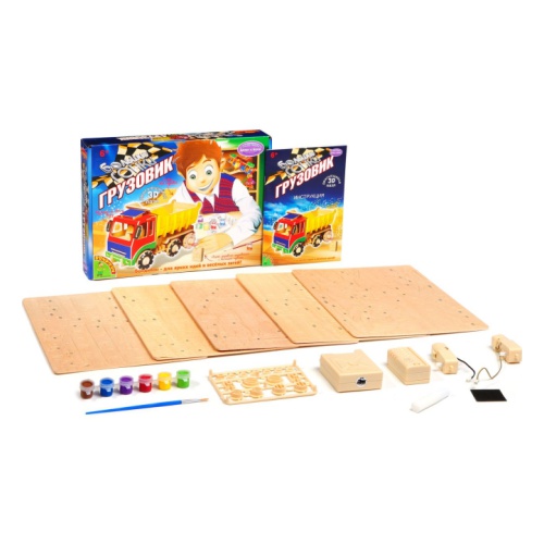 Мощный игрушечный грузовик, который двигается с пульта в четырех направлениях и издает звуки, как настоящий, – гордость любого мальчишки. Двойная гордость – большая и красивая грузовая машина, сделанная своими руками. С помощью крупных деревянных деталей конструктора ребенок самостоятельно соберет машину, а набор цветных красок поможет ему раскрасить грузовик в самые яркие и красивые цвета. Осталось юному механику прикрепить к машине моторчик на батарейках, взять в руки пульт управления – и можно отправляться в песочницу с замечательной игрушкой, чтобы вдоволь наиграться и удивить своих друзей.