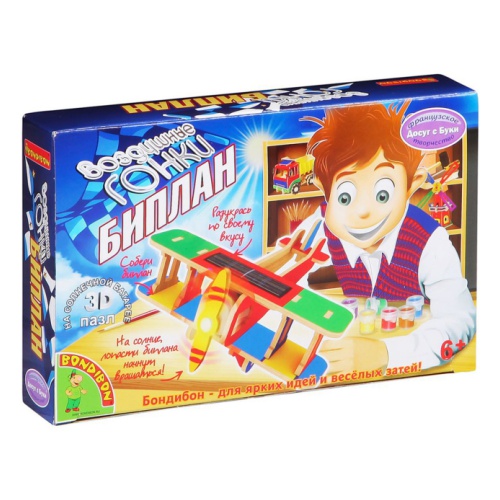 Французское творчество Досуг с Буки BONDIBON ВВ1211 Движущийся деревянный 3D пазл Воздушные гонки БипланМало кто из детей знает, что первые самолеты были деревянными, с двумя парами крыльев точно такими же, как биплан из этого конструктора. Создать собственную модель биплана это так заманчиво, увлекательно и совсем не сложно! Все детали конструктора собираются в виде пазлов, без дополнительного крепежа. Когда модель самолета будет собрана, можно раскрасить ее цветными красками тогда самолет станет ярким и красивым. Осталось только вставить в игрушку моторчик с солнечной батареей, которая позволит лопастям пропеллера вращаться и настоящий, собственноручно собранный биплан готов!