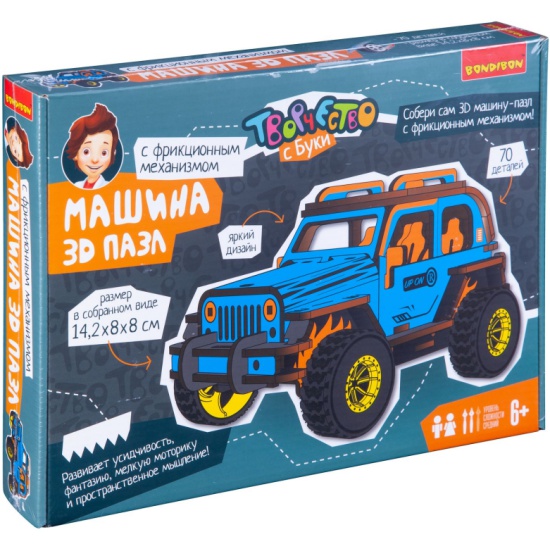 Набор BONDIBON ВВ4681 Творчество с Буки. 3D-пазл ВнедорожникС помощью яркого и оригинального 3D-пазла ребенок сможет самостоятельно собрать внедорожник с фрикционным механизмом, который позволит машинке при создании определенной силы трения-скольжения, быстро ездить вперед. Пазл состоит из 70 деталей, легко собирается. Все необходимое для сборки в комплекте. Готовая модель имеет размеры 14,2х8х8 см.Игра с объемным пазлом поможет ребенку в развитии усидчивости, фантазии, мелкой моторики и пространственного мышления.