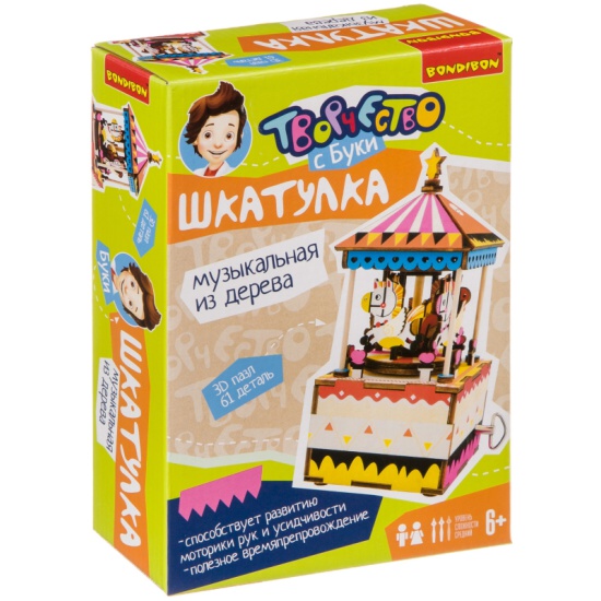 Набор BONDIBON ВВ4246 Творчество с Буки. 3D-пазл Музыкальная шкатулка КарусельМузыкальная шкатулка это маленькое чудо с двухсотлетней историей. Один поворот ключа - и звучит чудесная мелодия! Секрет спрятан внутри - звук рождает соприкосновение специальных зубчиков и тонких металлических пластин.Первая музыкальная шкатулка появилась в Швейцарии. В 1796 году часовой мастер Антуан Фавр изобрёл особый механизм, позволяющий воспроизводить мелодии. Необыкновенные вещицы очень быстро стали популярны, сохранившись и до нашего времени. Этот набор поможет ребенку смастерить настоящую музыкальную шкатулку! Собрав ее, Ваш юный механик получит не только волшебный музыкальный инструмент, но и красивое украшение своей комнаты!