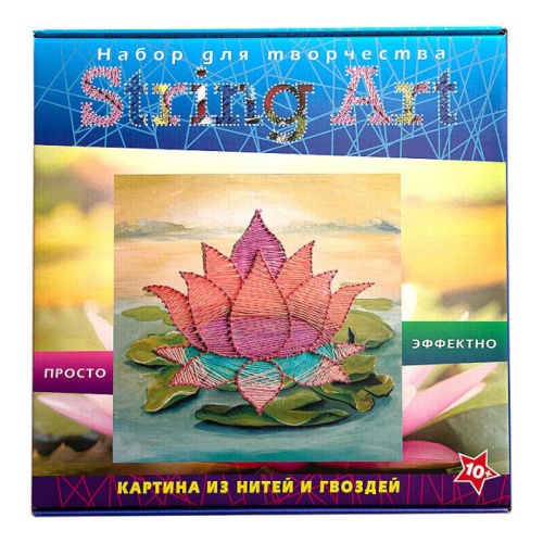 Стринг арт ВОЛШЕБНАЯ МАСТЕРСКАЯ ST-06 ЛотосУровень сложности: 2Размер готовой работы: 30×30 смТворчество совсем не новое, но оригинальное и простое. Родина его — Англия. Четыре века назад английские ткачи вбивали в дощечки гвозди и натягивали на них в определенной последовательности нити. Получались ажурные картины для украшения стен. Вы можете собственными руками создать яркий и оригинальный акцент в интерьере.