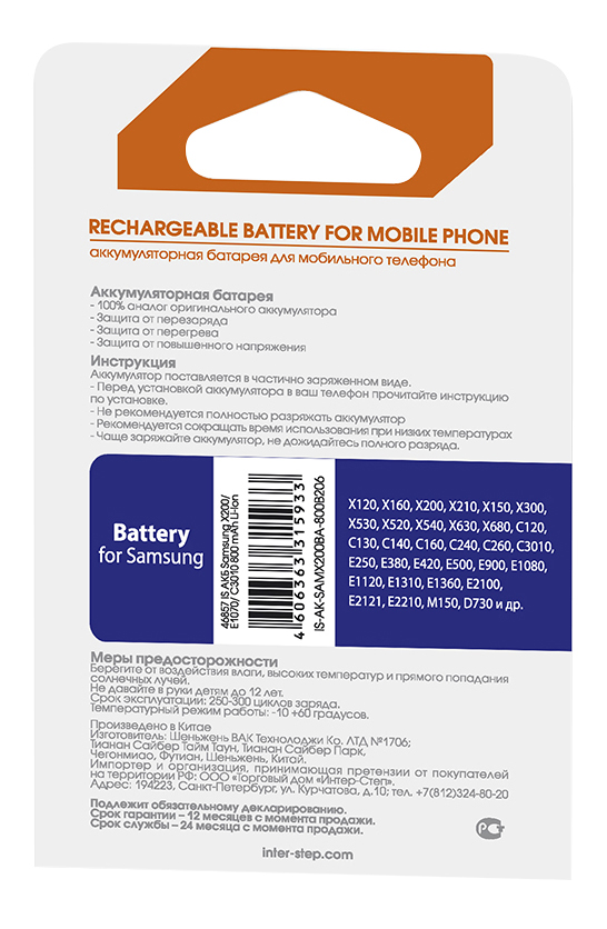 - Модель для Samsung X200 / E1070 / C3010 800 мАч