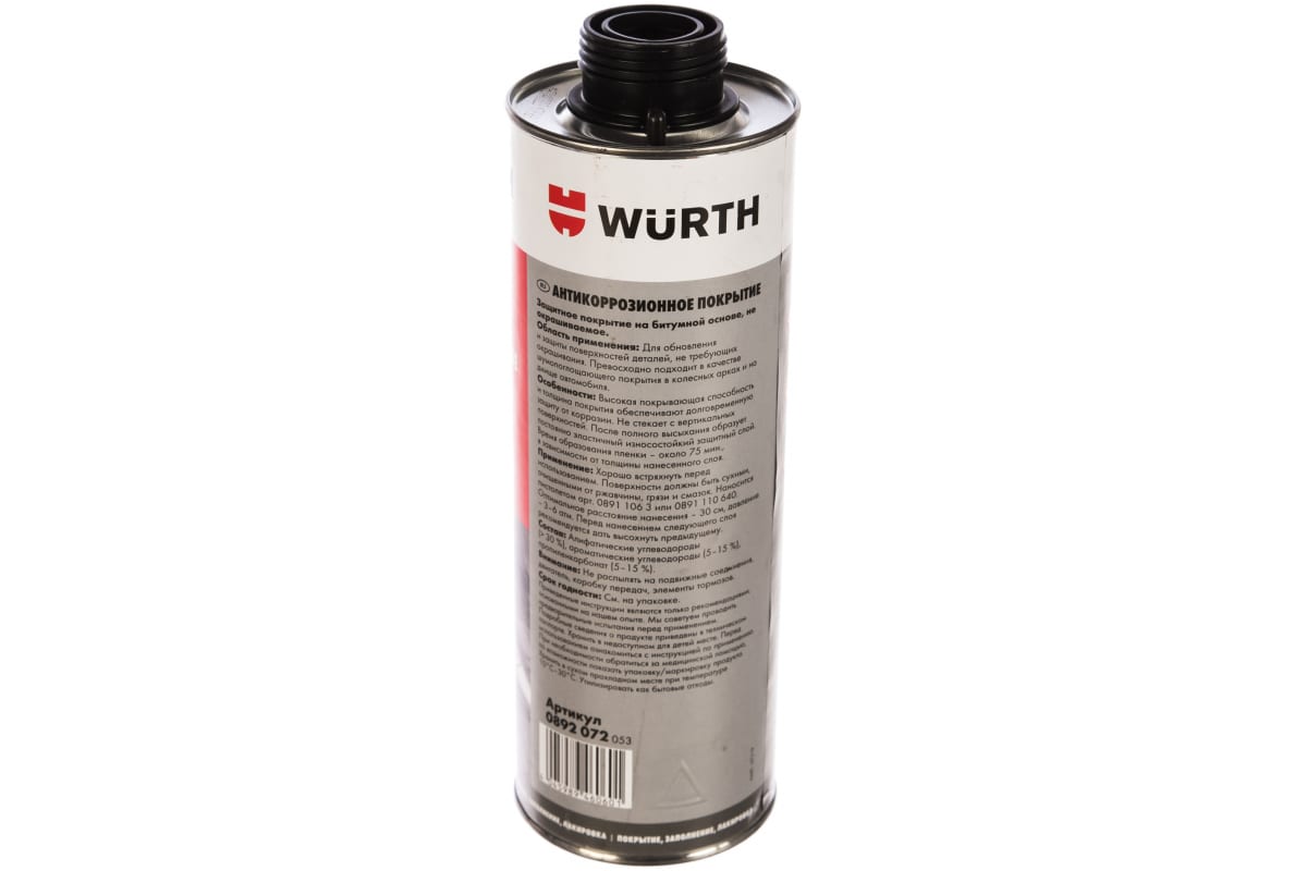 Антикоррозийное покрытие на основе битума WURTH 1000 мл 0892072 053 12 используется для ремонта и защиты скрытых полостей автомобиля: колесных арок, днища и т.д. Оптимальное расстояние при нанесении - 30 см.