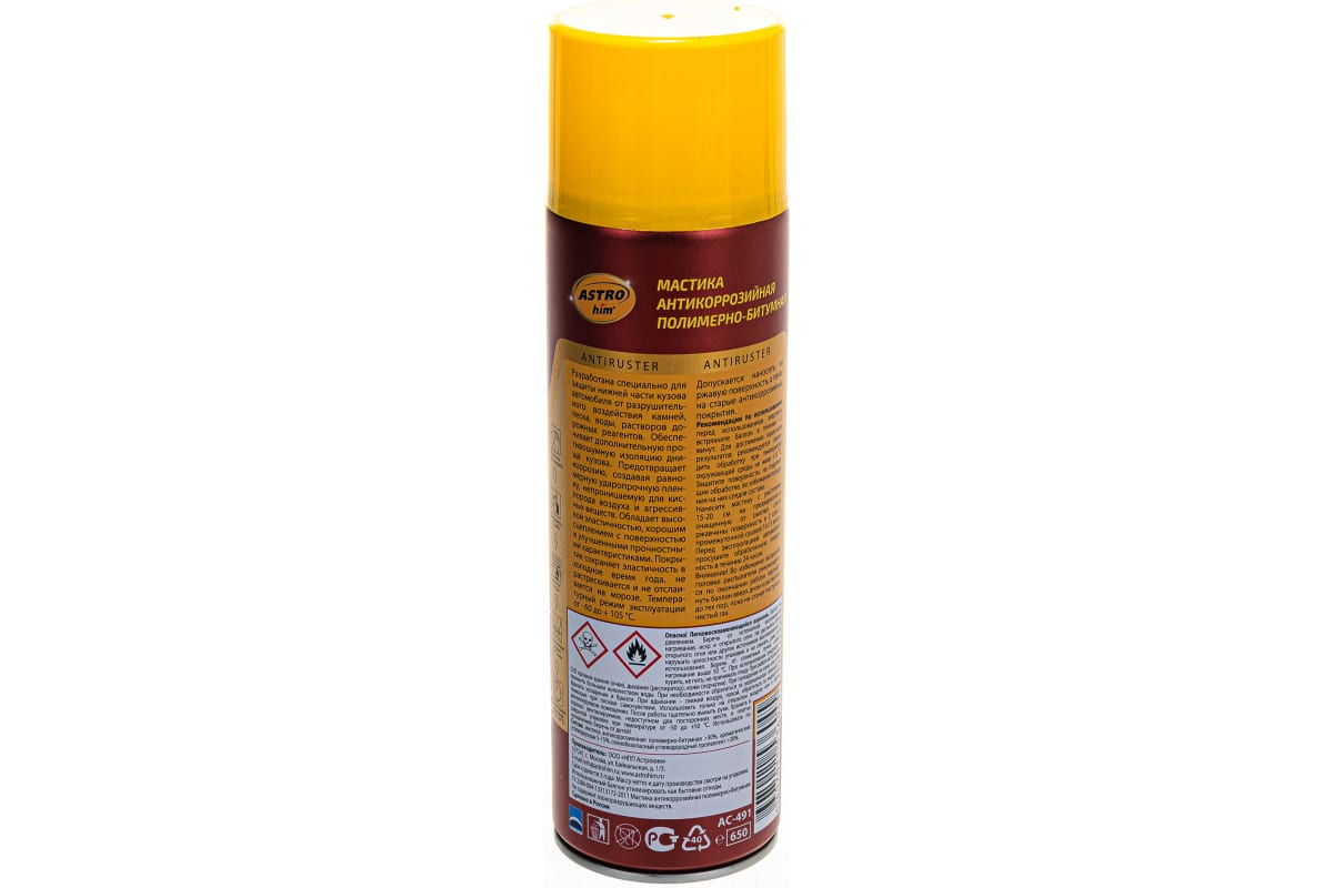 Антикоррозийная полимерно-битумная мастика ASTROhim аэрозоль, 650мл AC-491 используется для надежной защиты нижней части кузова автомобиля (пороги, корпуса дверей, стойки, лонжероны и т.п.) от коррозии.