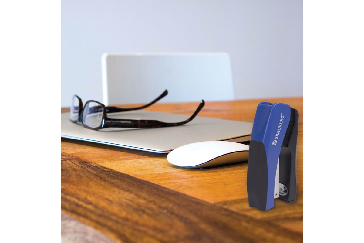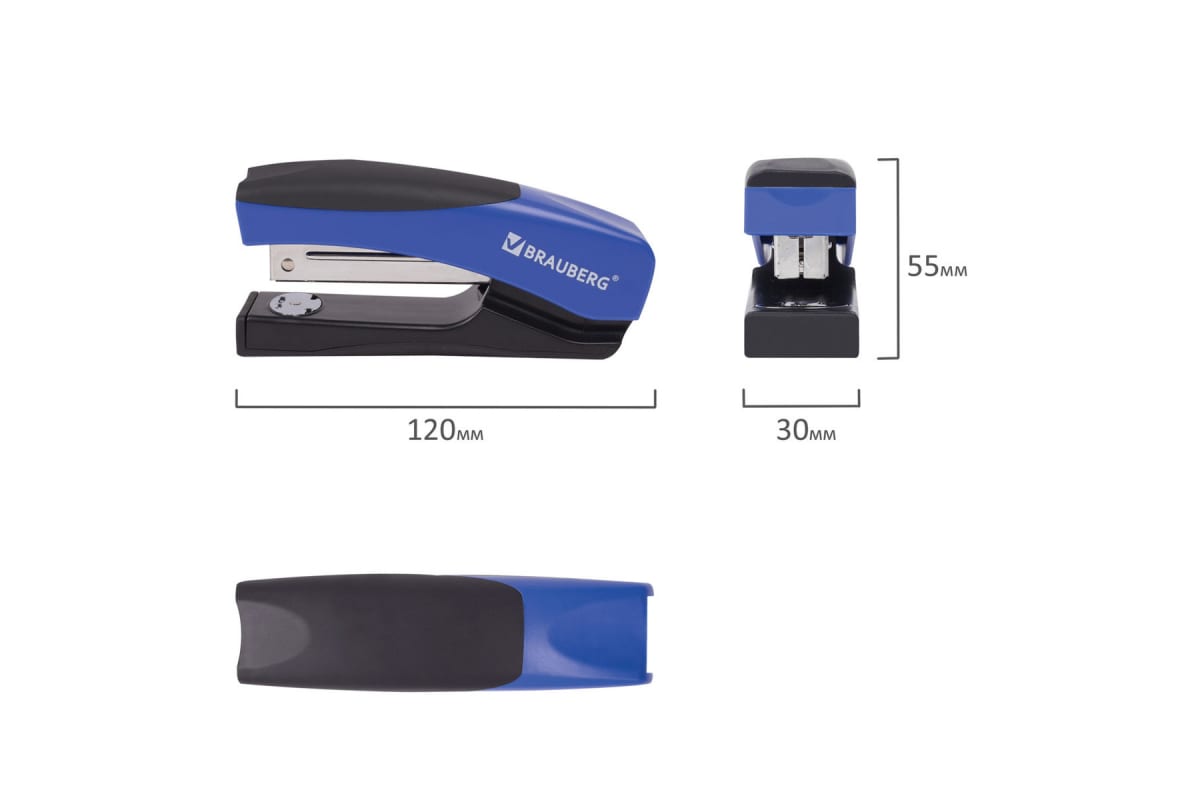 Степлер BRAUBERG №24/6, 26/6 Getze, черно-синий, 226866 удобен для быстрого соединения между собой нескольких листов бумаги. Инструмент можно использовать с упором в стол или в ладони.